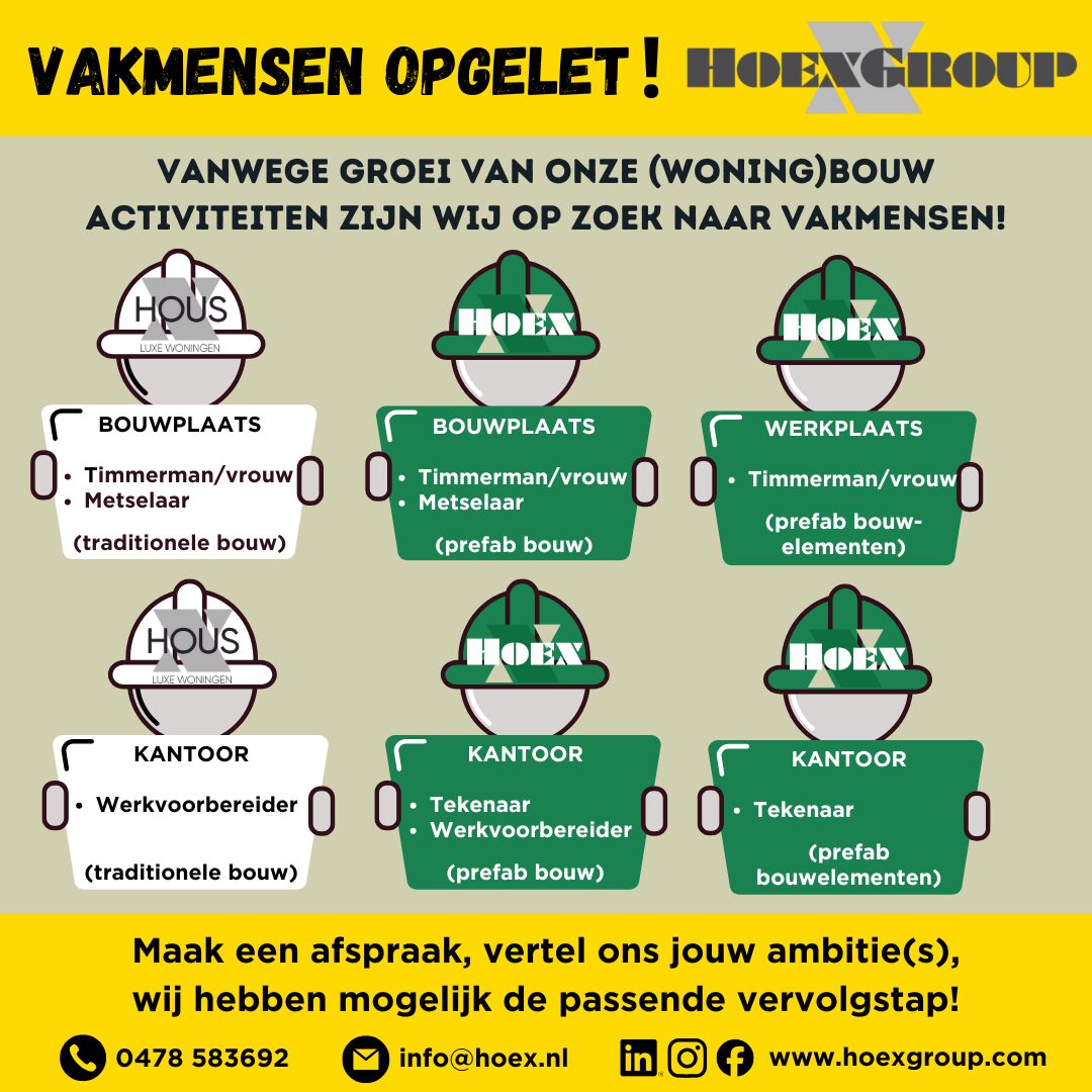 Onze (woning)bouw activiteiten groeien en daarom zijn wij op zoek naar diverse vakmensen! Zowel op de bouwplaats, de werkplaats als op kantoor.